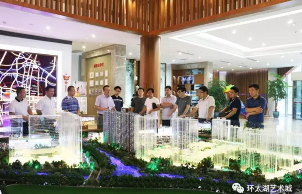來(lái)賓們首先到達(dá)環(huán)太湖藝術(shù)城項(xiàng)目接待中心,藝術(shù)城負(fù)責(zé)文化運(yùn)營(yíng)的楊志偉副總詳細(xì)介紹了藝術(shù)城的整體規(guī)劃、項(xiàng)目用地、產(chǎn)業(yè)布局、功能分布等情況。