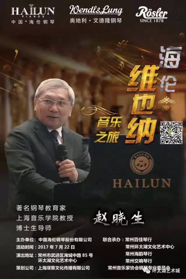 2017年7月22日,“維也納音樂(lè)之旅——趙曉生鋼琴獨(dú)奏音樂(lè)會(huì)”在中國(guó)·環(huán)太湖藝術(shù)城文化藝術(shù)中心的多功能廳隆重舉行。此次活動(dòng)由中國(guó)海倫鋼琴股份有限公司主辦,常州百佳琴行,常州環(huán)太湖文化藝術(shù)中心,常州海韻琴行,常州交響琴行,常州音樂(lè)家協(xié)會(huì)鋼琴專(zhuān)業(yè)委員會(huì)聯(lián)合承辦。